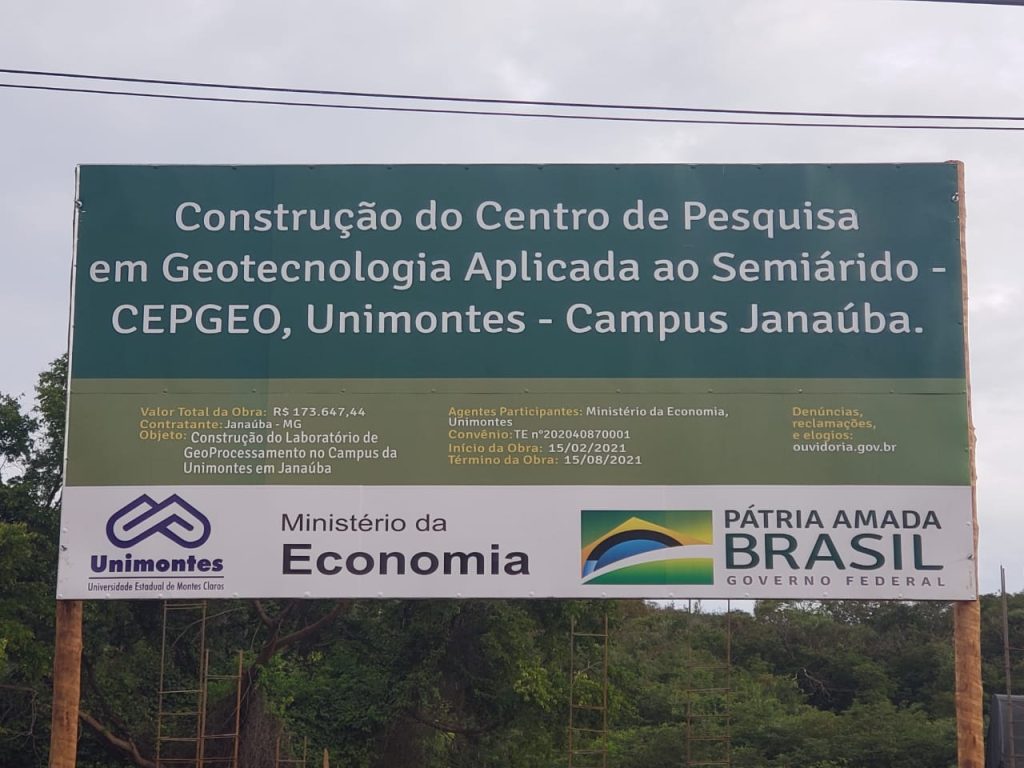 As obras para o Centro de Pesquisa “Geotecnologia Aplicada ao Semiárido”, da Unimontes – campus de Janaúba -  começaram em fevereiro deste ano. Os recursos para o laboratório são de emendas do senador Carlos Viana (PSD-MG). Foram enviados R$ 250 mil para investimentos na universidade. Ao todo, serão beneficiados 500 alunos.